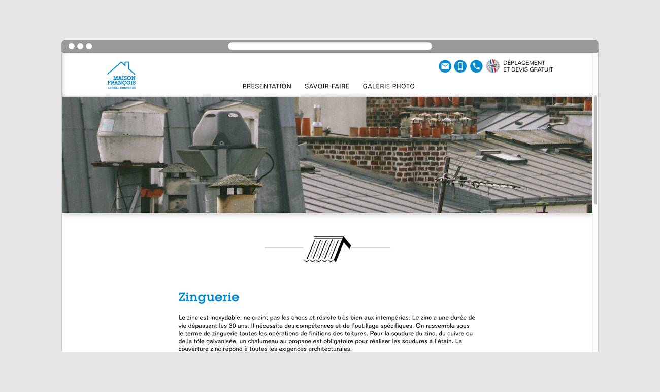 Échange de bon procédé, après avoir rénové intégralement ma toiture, M. François, artisan couvreur du bassin parisien spécialiste du zinc, me commande son identité visuelle ainsi que ses supports de prédilections : flyer, habillage de son véhicule et site Internet. Il a besoin de développer la confiance des potentiels nouveaux clients, de moderniser son image, de présenter ses compétences et d’un bon référencement naturel. Le site Internet est développé sur WordPress avec un thème sur-mesure. Nous avons aussi créé des contenus sur-mesure et mis en place une galerie photos de ses chantiers et aussi la possibilité pour ses clients de déposer leur avis.